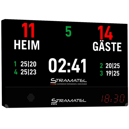 Diese 3-in-1-Anzeigetafel ermöglicht es Ihnen, den Spielstand Ihrer Spiele anzuzeigen, die Ankündigungen Ihrer Partner zu übertragen und Ihre Begegnungen durch personalisierte Videoanimationen für die Zuschauer zu beleben.