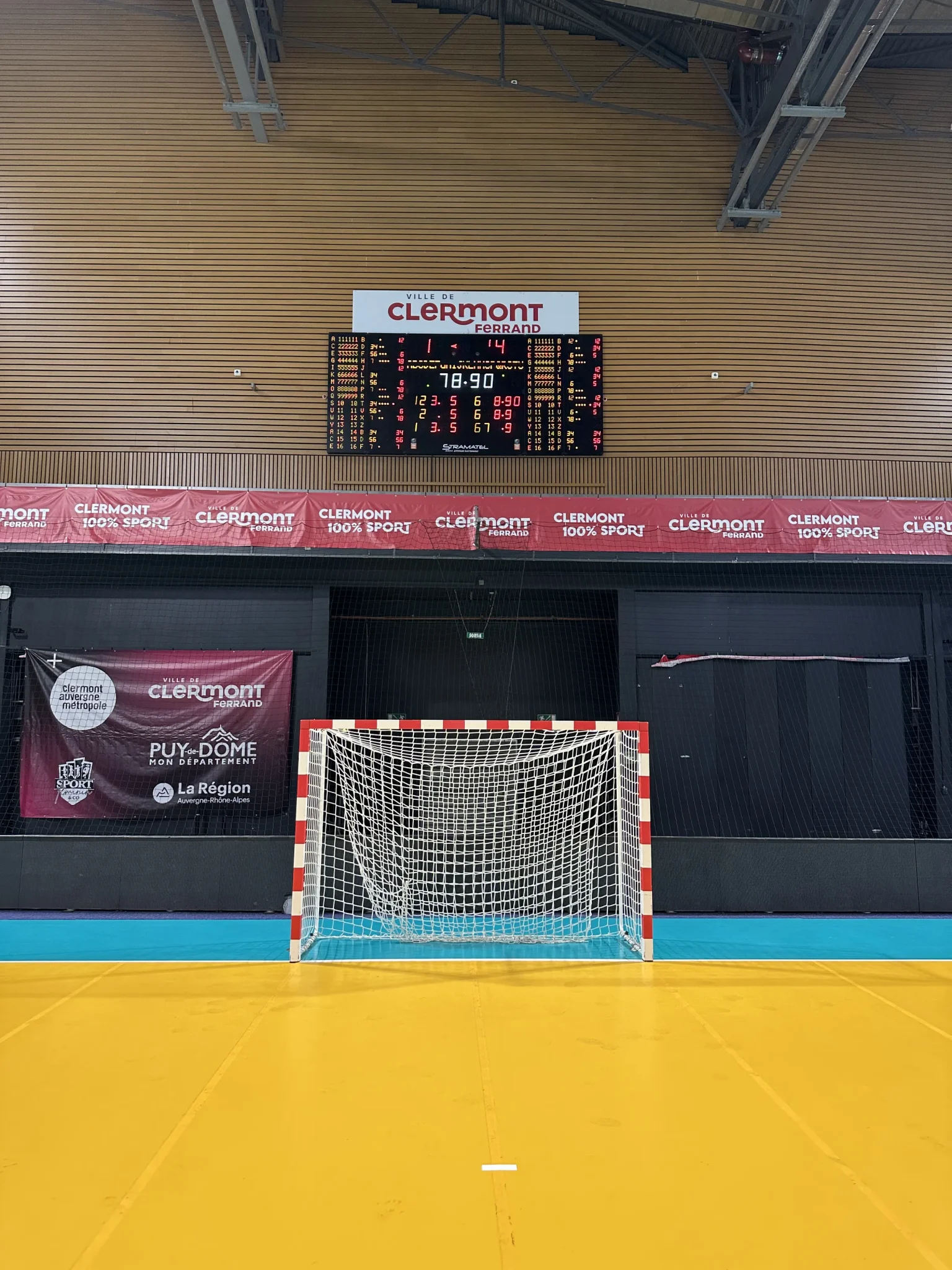 Pour le basketball, l’installation intègre une paire d’afficheurs de temps d’attaque 24 secondes à quatre faces, montés directement sur les structures des buts. Cette configuration assure une visibilité optimale depuis tous les angles de jeu et pour tous les acteurs (joueurs, arbitres et spectateurs).