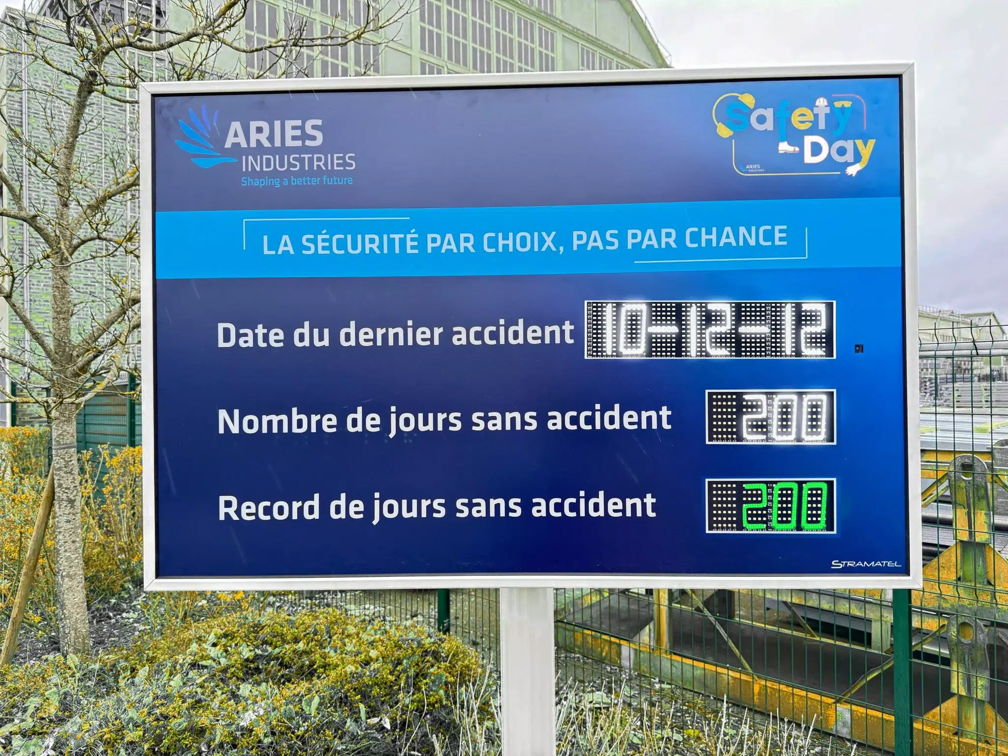 Chez Stramatel, nous savons que l’appropriation de l’outil par les salariés passe par le design. L’afficheur d’Aries Industrie a été intégralement personnalisé pour respecter leur charte graphique : couleurs, logos, et même l’intégration d’un picto spécial dédié au « Safety Day ».