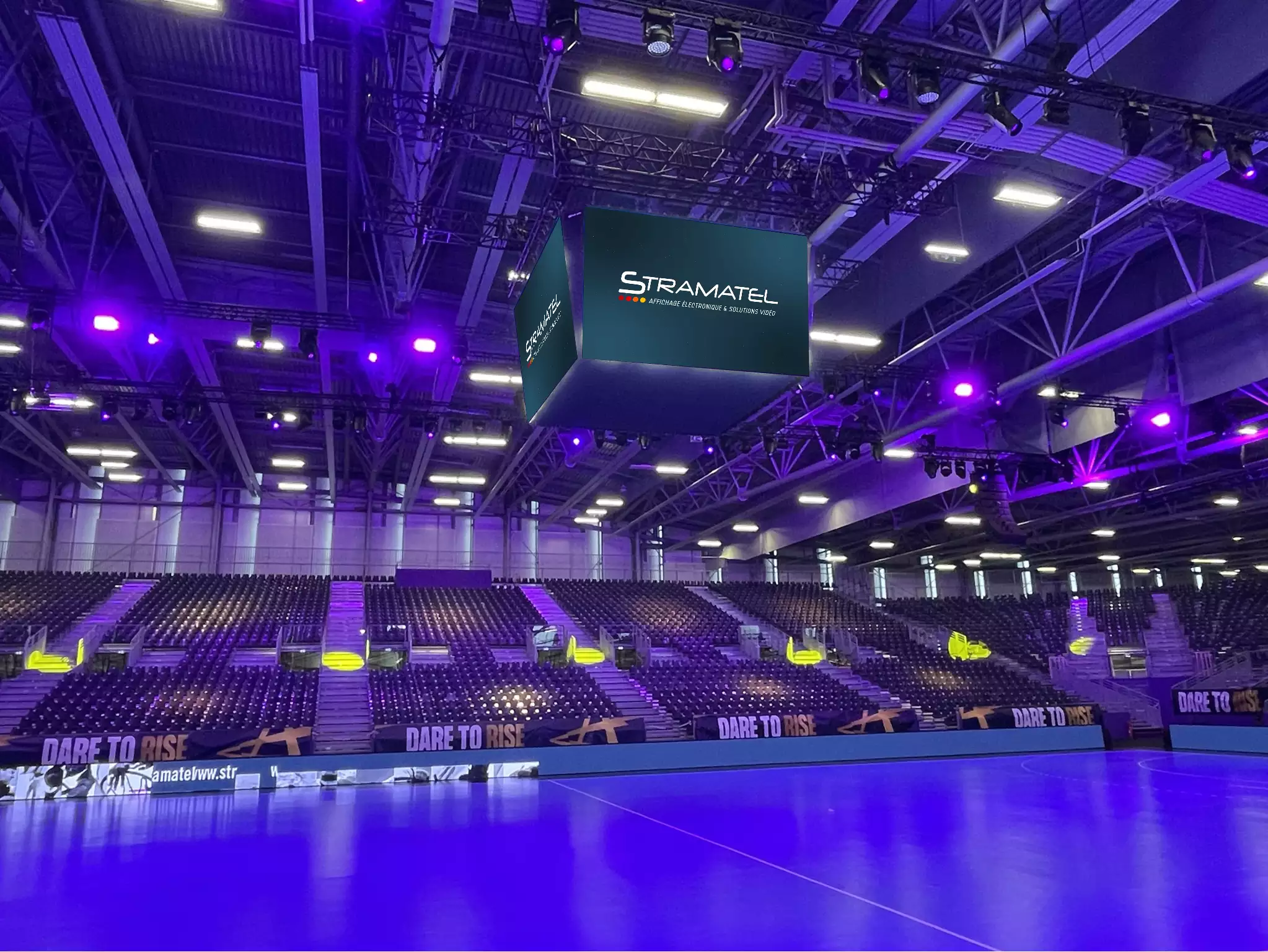 Pour ces rencontres délocalisées, Stramatel met en place un dispositif complet d’affichage sportif, transformant le Hall XXL en une véritable arène de handball moderne. Reconnue pour notre expertise dans l’équipement sportif, nous proposons au club une gamme de solutions innovantes :